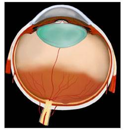 Premature eye with developed retina (blood vessels on orange-colored surface) and undeveloped retina (no blood vessels in peach- colored peripheral retina).