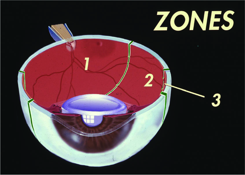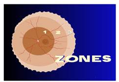 The diagrams below show the zones of the premature retina. As the premature blood vessels grow from the back to the front of the eye, the amount of premature retina decreases. At full-term, the blood vessels extend to nearly the entire retina.